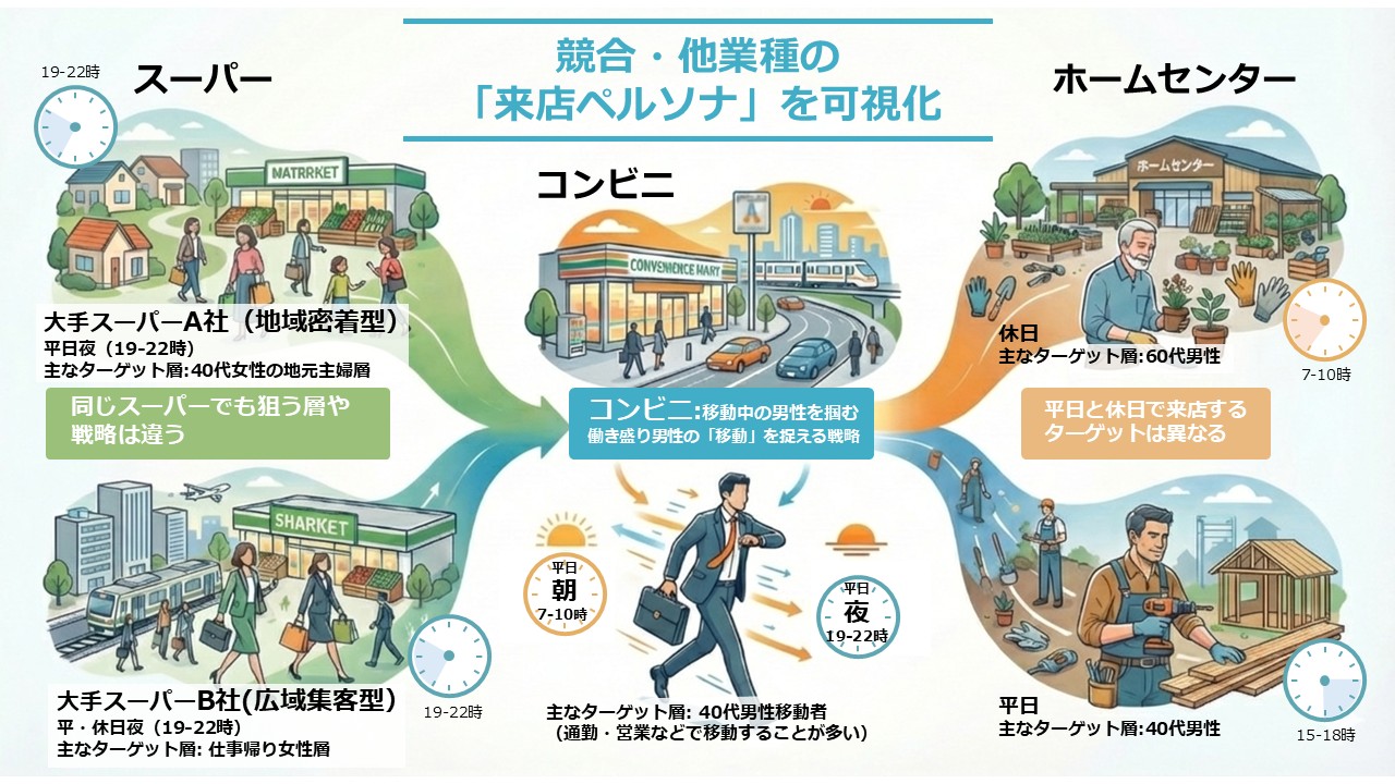 大手スーパーB社(例:広域集客型): 平日・休日夜(19-22時)に「移動中の40代女性(仕事帰り層)」が多く来訪している。